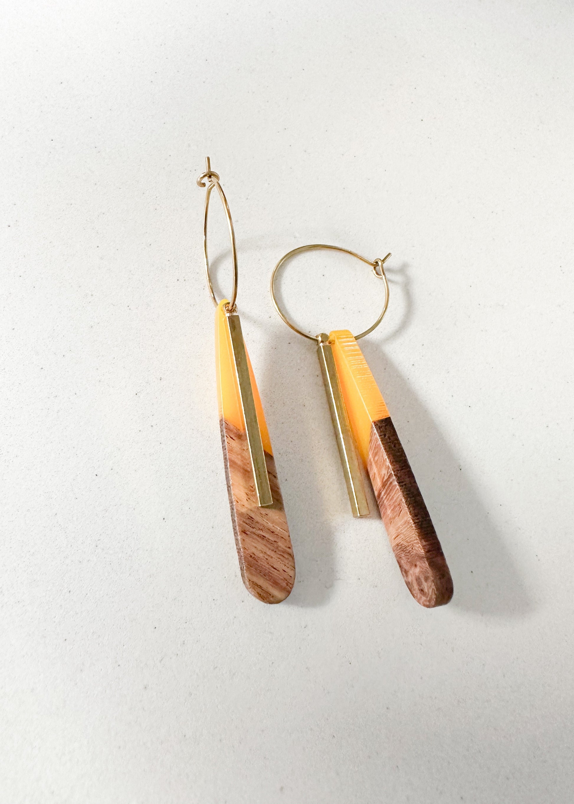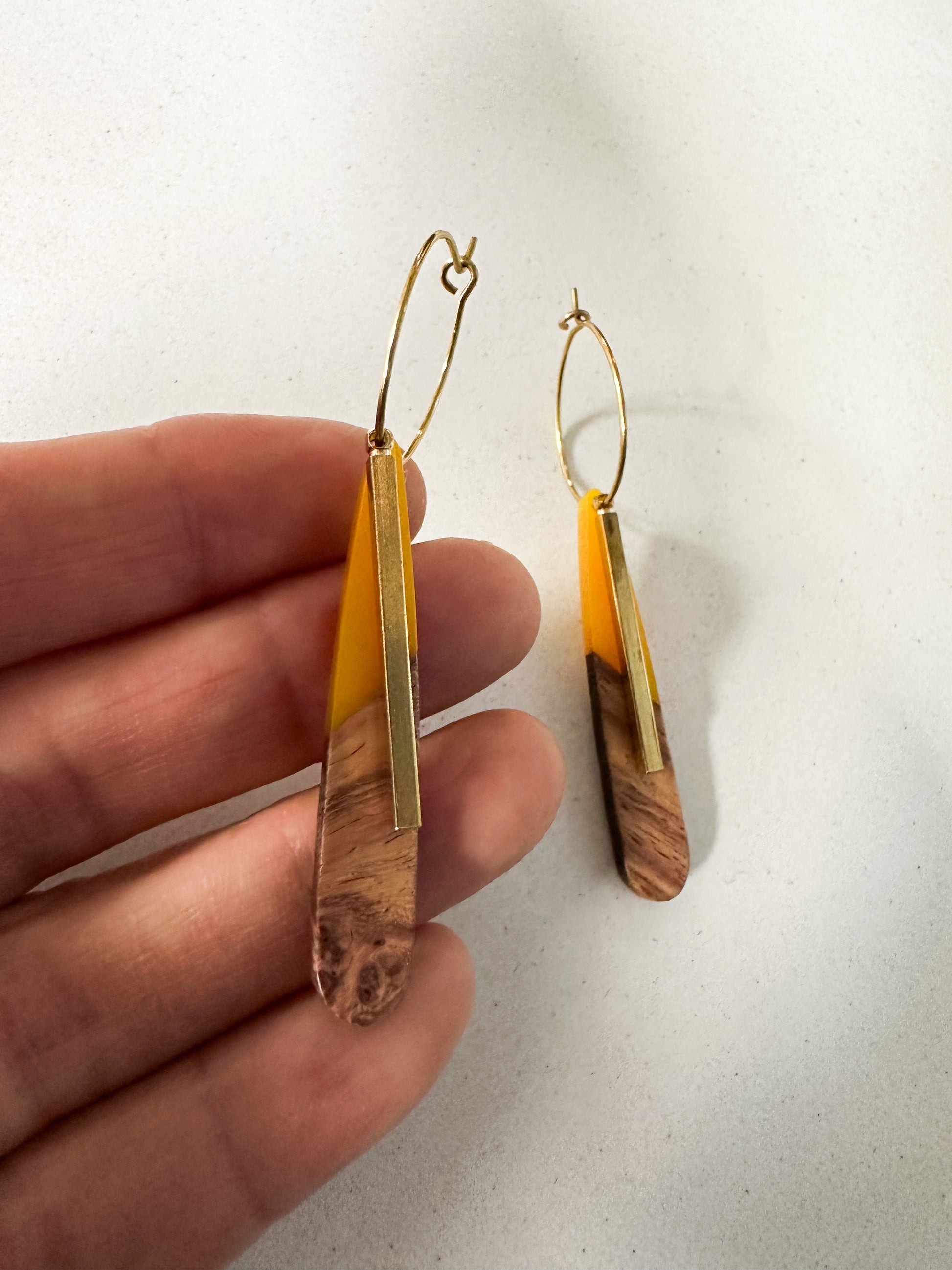 Beautiful, simple & lightweight..lovely polished wood teardrop dangle with coloured resin inset on brass wee hoops and a layering brass stick accent.